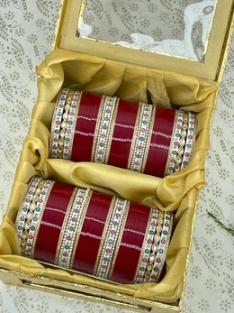 Beautiful kundan bridal chuda made with traditional white dots bangles on sides with kundan bangle in between them and white dots bangles also in center surrounded by pearls bangles and all are combined with traditional blood red colored seep bangles