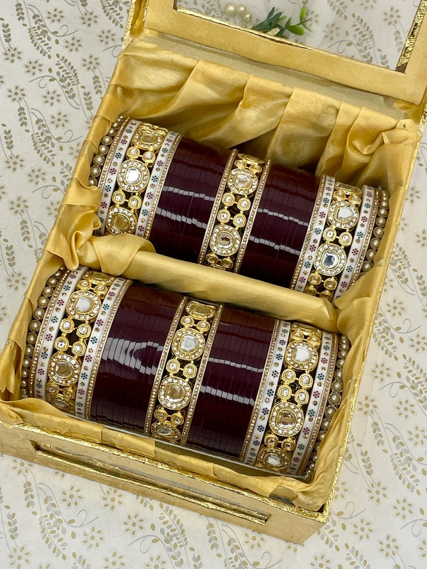Beautiful Kundan bridal Chuda made with three kundan kangans and pearl bangkes on the sides along with flower dots white bangles on the kangan's sides and with golden nikhar, and all of them are attached with dark maroon seep bangles