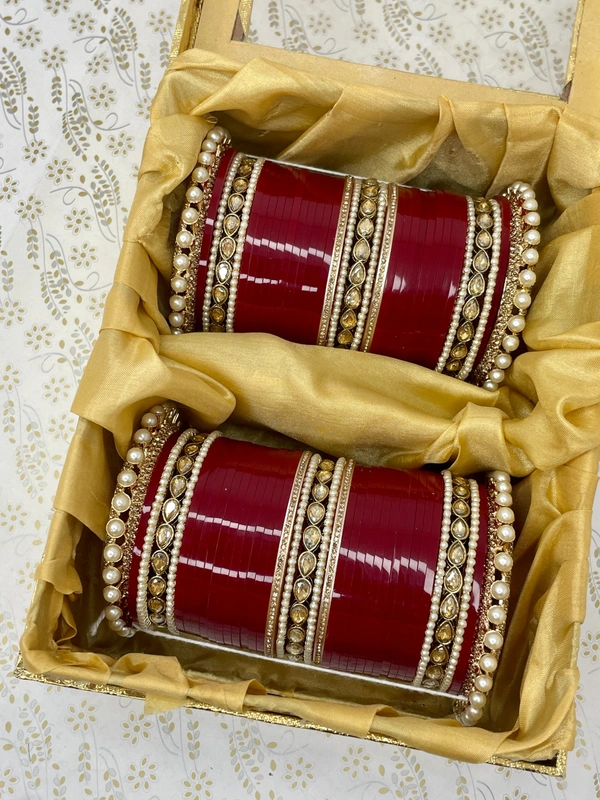 Beautiful Pearls bangles in the end and kundan bangles in the center along with pearl bangles and all combined with traditional blood red seep bangles