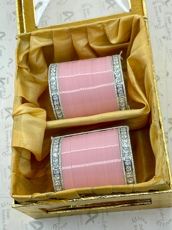 Very elegant sleek AD bangles on the sides with square Sworski Crystal Kangan in the center and very pretty rose pink seep bangles