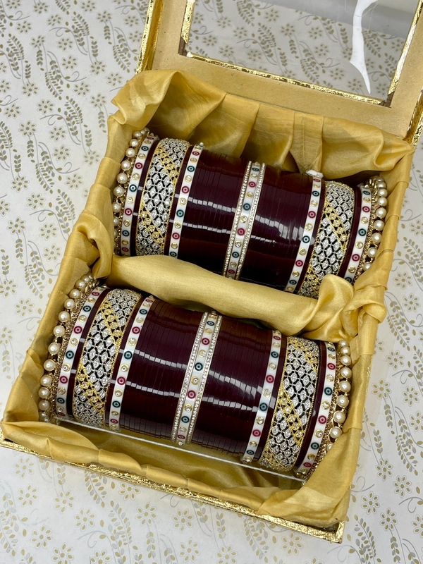 Beautiful American Diamond chuda made with golden pearls pachelli bangles in the end and AD bangles along with kundan white dots traditional bangles on the sides and all are combined with dark maroon traditional seep bangles