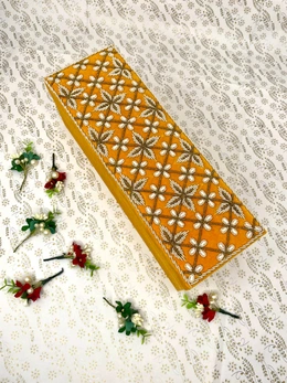 Hand Embroidered Yellow Chuda/Bangle box made with sued fabric, and hard board, so that you can keep your Chuda or precious bangles intact.