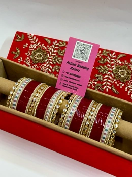 Celebrate your wedding traditions with our premium bridal chura set, expertly handcrafted in Patiala, Punjab, the heart of authentic Punjabi bridal jewellery. This red bridal chura features rich glossy bangles beautifully decorated with kundan stones, pearl work, and gold-finish detailing, making it a perfect choice for Punjabi brides, Sikh weddings, and Indian bridal ceremonies.
