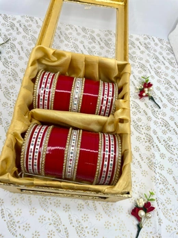 Elegant tomato red color bangles with traditional flower pattern white bangles in both center and in the end makes this chuda exquisite piece