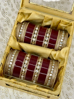 Beautiful chuda made with two different shaped kundan bangles along with pearl seep bangles on the end and golden nikhars for detailing and all are combined with maroon colored seep bangles