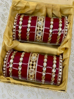 Bold look bridal chuda madwe with kundan bangles in the center and crystal pachelli bangles on the sides and all attached with blood red colored seep bangles
