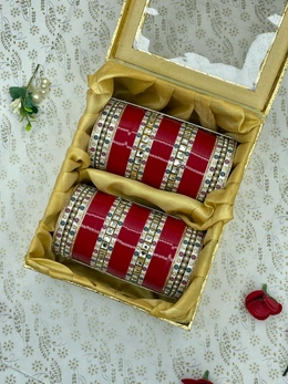 Very stunning desgn made with square kundan kangans surrounded by traditional white dots bangles and same bangles also on the sides with pearl bangle between them and all are combined with traditional blood red colored bangles