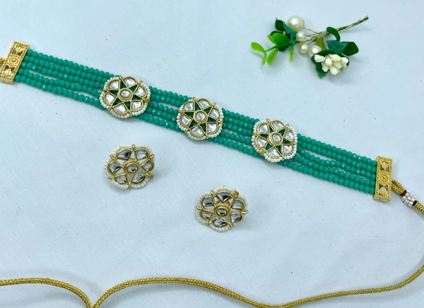 Elegant Choker Necklace in Sea Green Colored with cute peals and kundan studs.