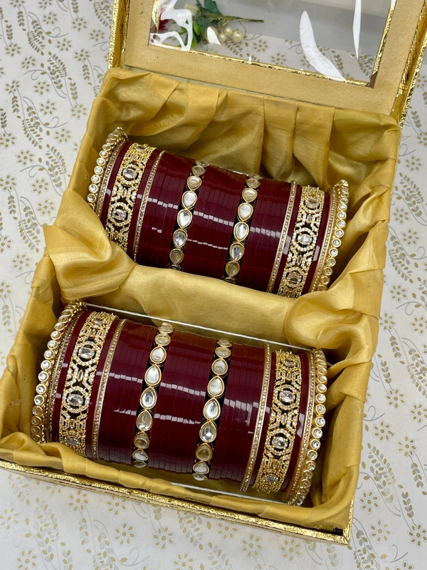 Astonishing Design made with kundan pachelli bangle on the end and beautiful AD bangles on the sides surrounded with golden nikhars and 2 kundan bangles in the center and all combined with maroon colored seep bangles