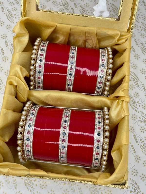 Beautiful and simple chuda design made with golden pearl pachelli bangles on the sides along with traditional white dots bangles and golden nikhar and all combined with traditional red seep bangles