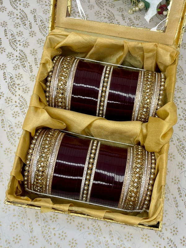 Beautiful Seep kangans surrounded by both golden and silver nikhars and pearl bangles on the sides and in the center, all combined with dark maroon seep bangles