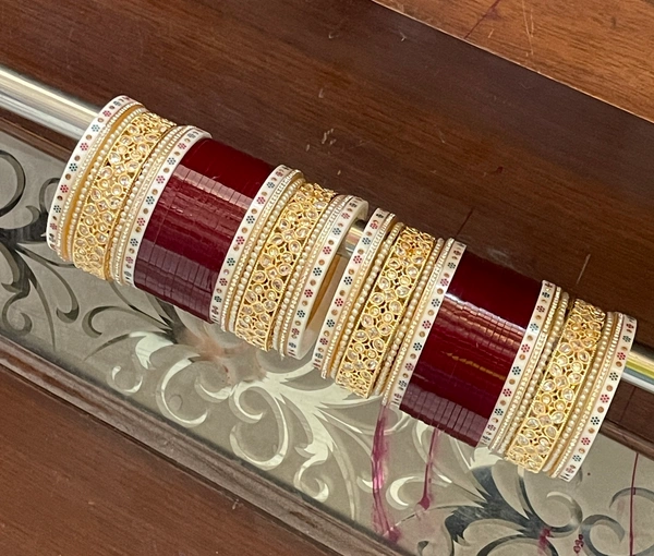 American Diamond Kangans on the sides along with trendy evil eye and pearl bangles around them and maroon color makes it a gorgeous Short Chura