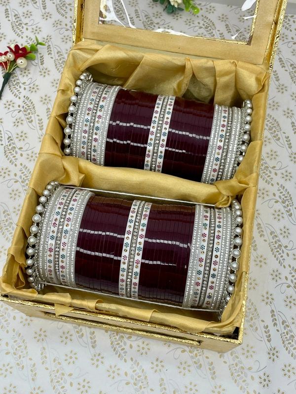 Stunning Pearl Pachelli Kangans on the sides along with silver pearl bangles and flower pattern traditional seep bangles in the center and on sides, all combined with dark maroon seep bangles