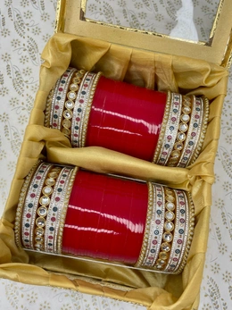 Very beautiful Kundan chuda made with round kundan bangles on the sides along with white dots bangles on the sides and silver nikhars and in the end pearl seep bangles, And all combined with traditional red colored seep bangles.