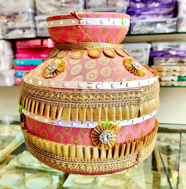 Bride/Grooms maternal aunt (Mammi) carries the decorated copper vessel with diya over it and lit with mustard oil, on her head and other ladies try to shake it with long decorative sticks with bells.