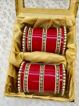 Beautiful Pearl Pachelli Bangles with small pearl bangles along with kundan bangles in the center, all combined with blood red seep bangles.