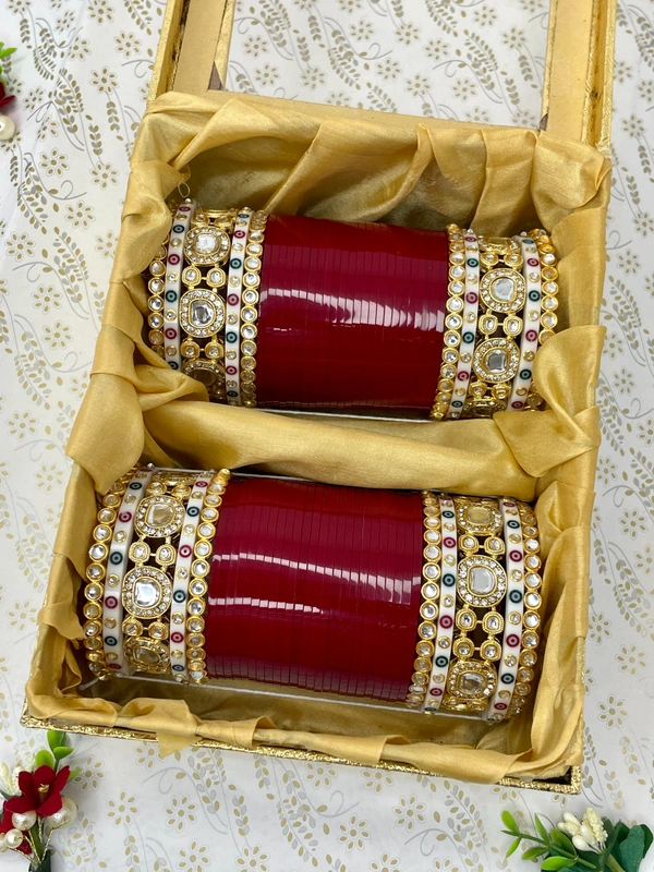 Astonishing broad kundan bangles along with traditional seep white dots bangles also studded with kundan stones and all surrounded by round shaped kundan bangles, with traditional blood red seep bangles