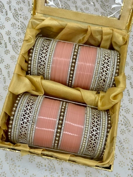 Elegant Designed Kangans on the sides surrounded by pearl bangles and white nikhars, all combined with peach seep bangles