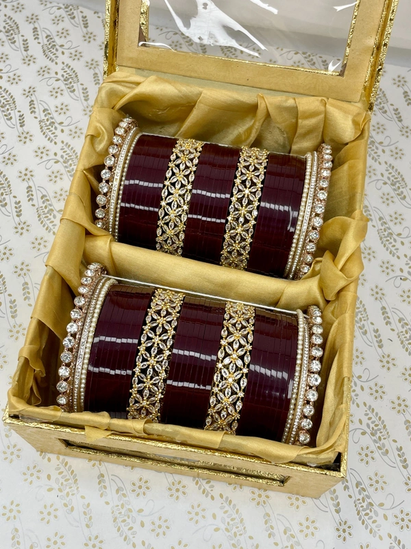 Stunning Crystal Pachelli Kangans on the sides with pearl bangles and very nice flower cut designed AD Kangans in the center all attached with maroon seep bangles