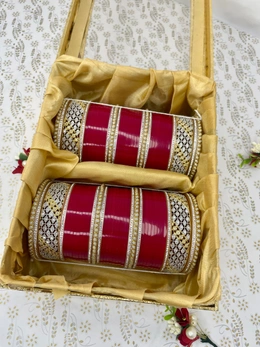 Latest Trending Design, made with broad Kundan kangen in the sides and one round kundan kangan in the chuda center all attached with traditional blood red bangles