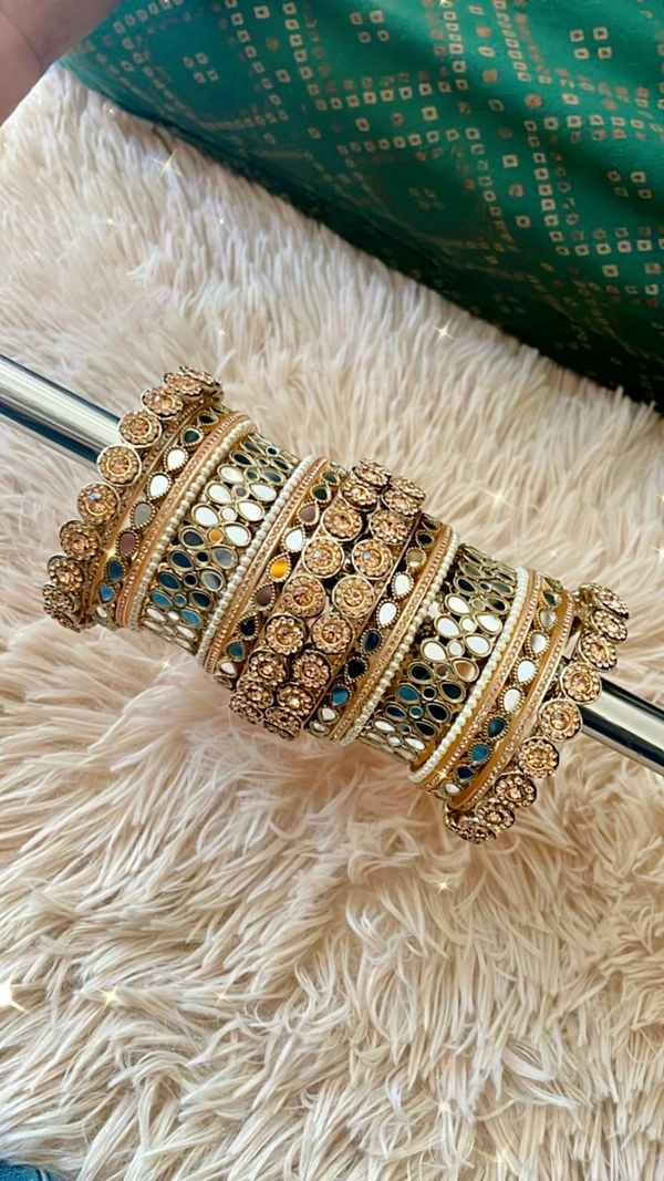 Beautiful mirror bangles set with stone studded pachelli kangans on the sides