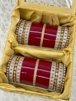 Beautiful Bridal chuda made with kundan bangles which are surrounded by white dots bangles along with golden nikhars and pearl bangles on the sides. And all combined with blood red seep bangles.