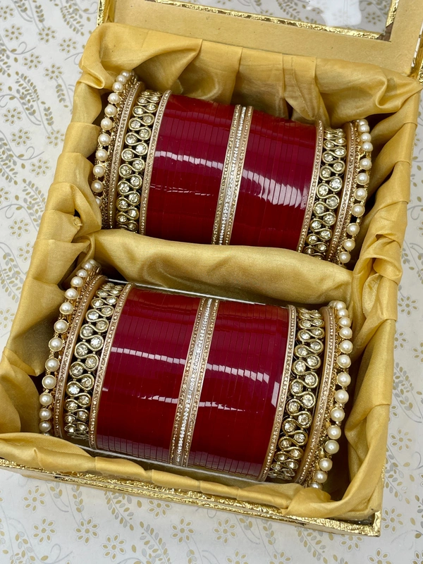 Amazing design made with golden pearl pachelli bangle in the end and crystal bangle on sides which are surrounded by golden nikhars and all combined with blood red bangles